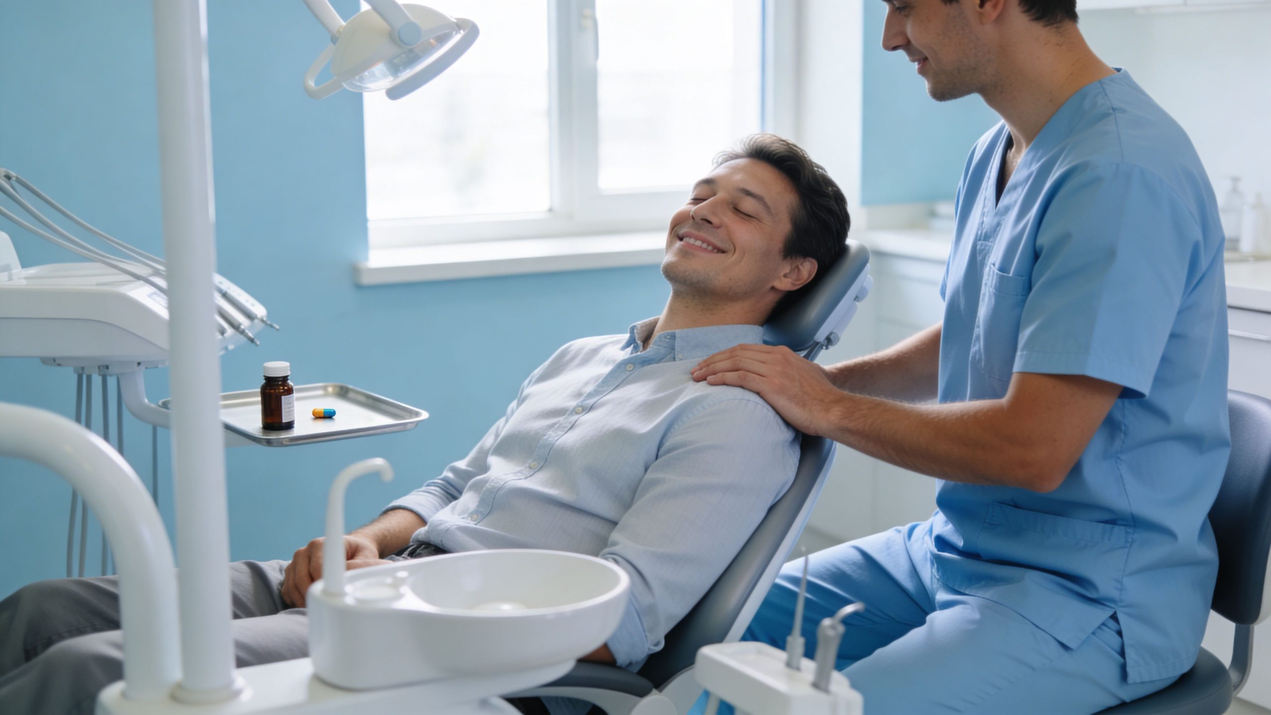 Oral sedation Awake but deeply relaxed Drowsy, calm, less reactive Dental clinic